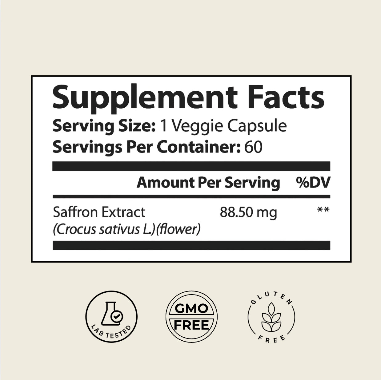 Each capsule delivers a clinically backed 88.5 mg dose of standardized saffron extract, providing crocins for mood elevation and safranal for calm clarity.